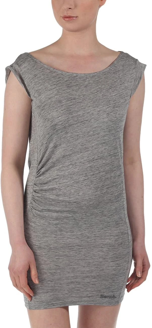 Slank gesneden, mouwloze jurk van gemêleerde jersey. Wijde halslijn aan de voorzijde, mooie waterval halslijn aan de achterzijde. Leuke look met ruches aan de zijkant bij de taille aan de linkerkant. Bench logo op de achterkant van de zoom.