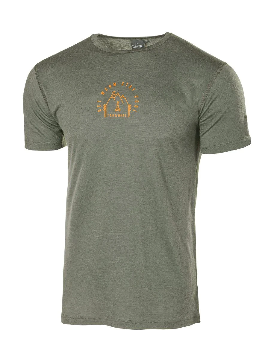 Mooi T-shirt van Ivanhoe of Sweden. Het T-shirt is gemaakt van 100% Merino wol, het heeft een ronde nek en een outdoor print op het shirt in het oranje.