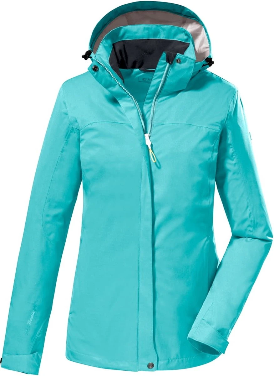 Functionele dames zomerjas van Killtec Kleur: aqua. Functionele, mooie zomerjas met de volgende eigenschappen: winddicht, waterdicht, ademend, waterkolom 10.000mm, afritsbare capuchon. Gemaakt van 100% polyester.
