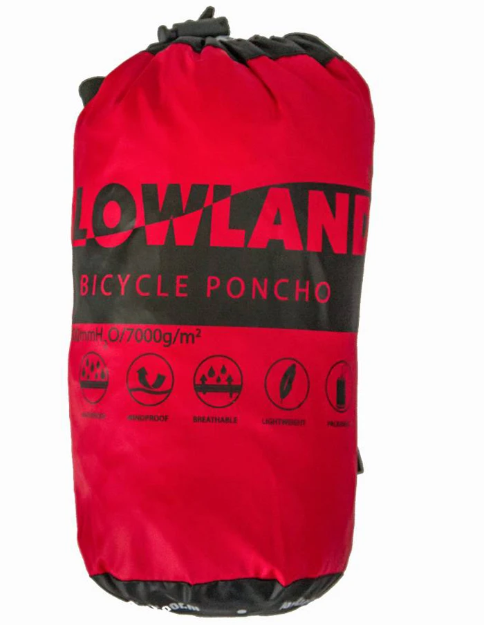 De LOWLAND OUTDOOR fietsponcho kan je als een klein opgerold pakje gemakkelijk in je tas kwijt en heb je zodra het gaat regenen in een oogwenk over je heen geslagen! De Lowland Outdoor fietsponcho heeft een flap die je over je stuur gooit, zodat ook je handen en benen droog blijven. De kraag van de poncho loopt automatisch door in de voorgevormde en traploos verstelbare capuchon die uitstekend geschikt is voor fietshelmen, zodat ook het hoofd volkomen droog blijft.